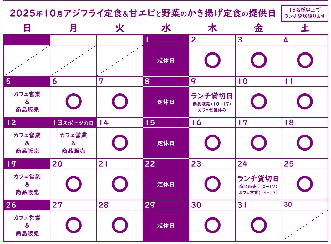 〇印の日に『アジフライ定食』『甘エビと季節野菜のかき揚げ定食』