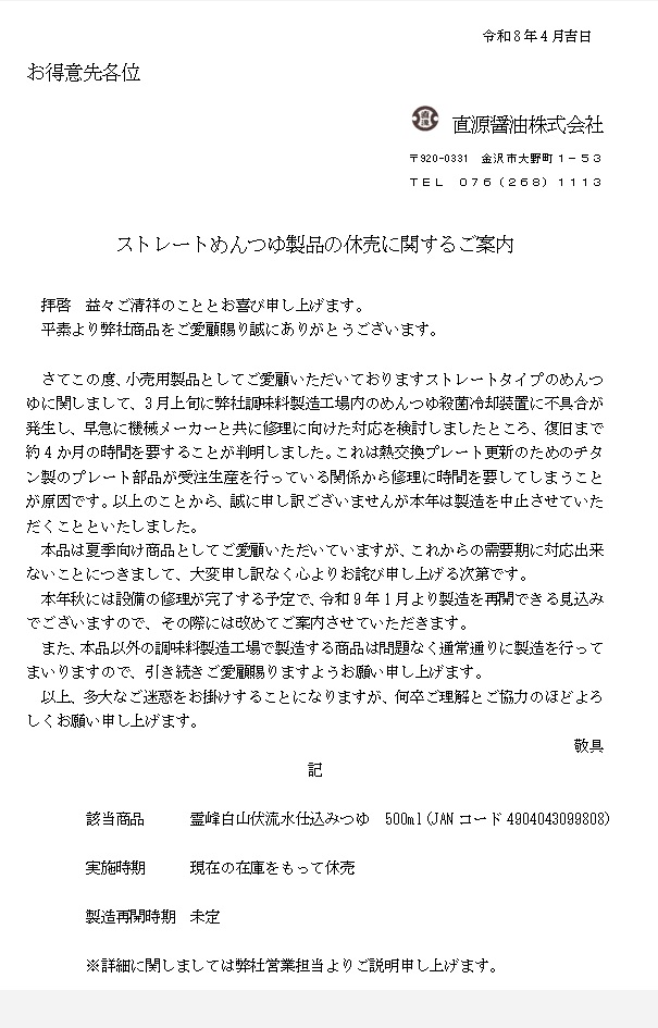 直源醤油株式会社〒920-0331 石川県金沢市大野町1-53 TEL 076-268-1113 FAX 076-267-4446